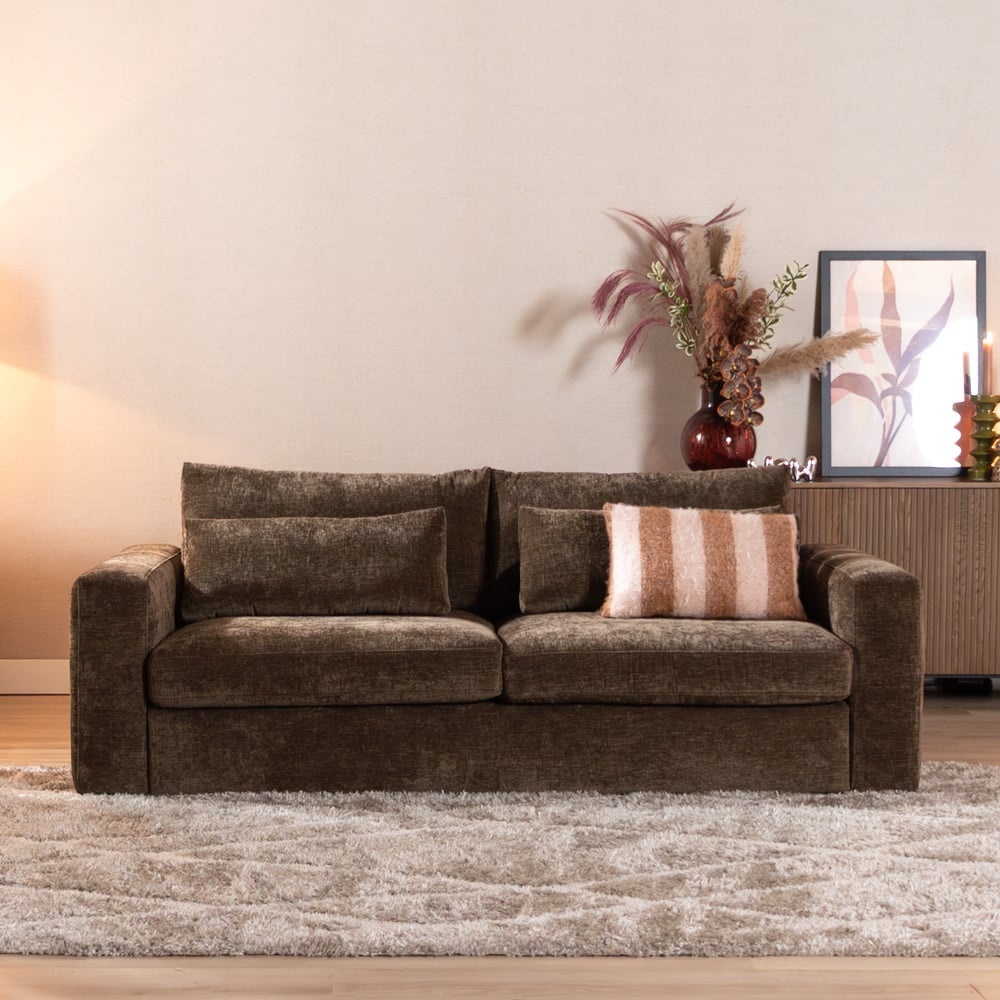 3-zitsbank Kyle is bekleed met Eddy chenille, een hoogwaardige stof van 100% polyester, waterafstotend en gecertificeerd volgens REACH en OEKO-TEX normen. Chenille staat bekend om de volle, zachte structuur en is extra comfortabel om op te zitten. De stof heeft een Martindale score van 60.000, wat betekent dat deze bank uitermate slijtvast is en geschikt voor intensief (dagelijks) gebruik. De bank is afgewerkt met een waterafstotende toplaag, dus vloeistoffen dringen niet direct door en zijn makkelijk te verwijderen. Let op: door de structuur van de chenille kan bij bepaalde lichtinval shading optreden, wat zorgt voor natuurlijke kleurvariaties. Het frame is degelijk uitgevoerd met nosagveren, houten platen, beuken- en grenenhout, waardoor de zitbanken een lange levensduur hebben en een stabiele basis bieden.