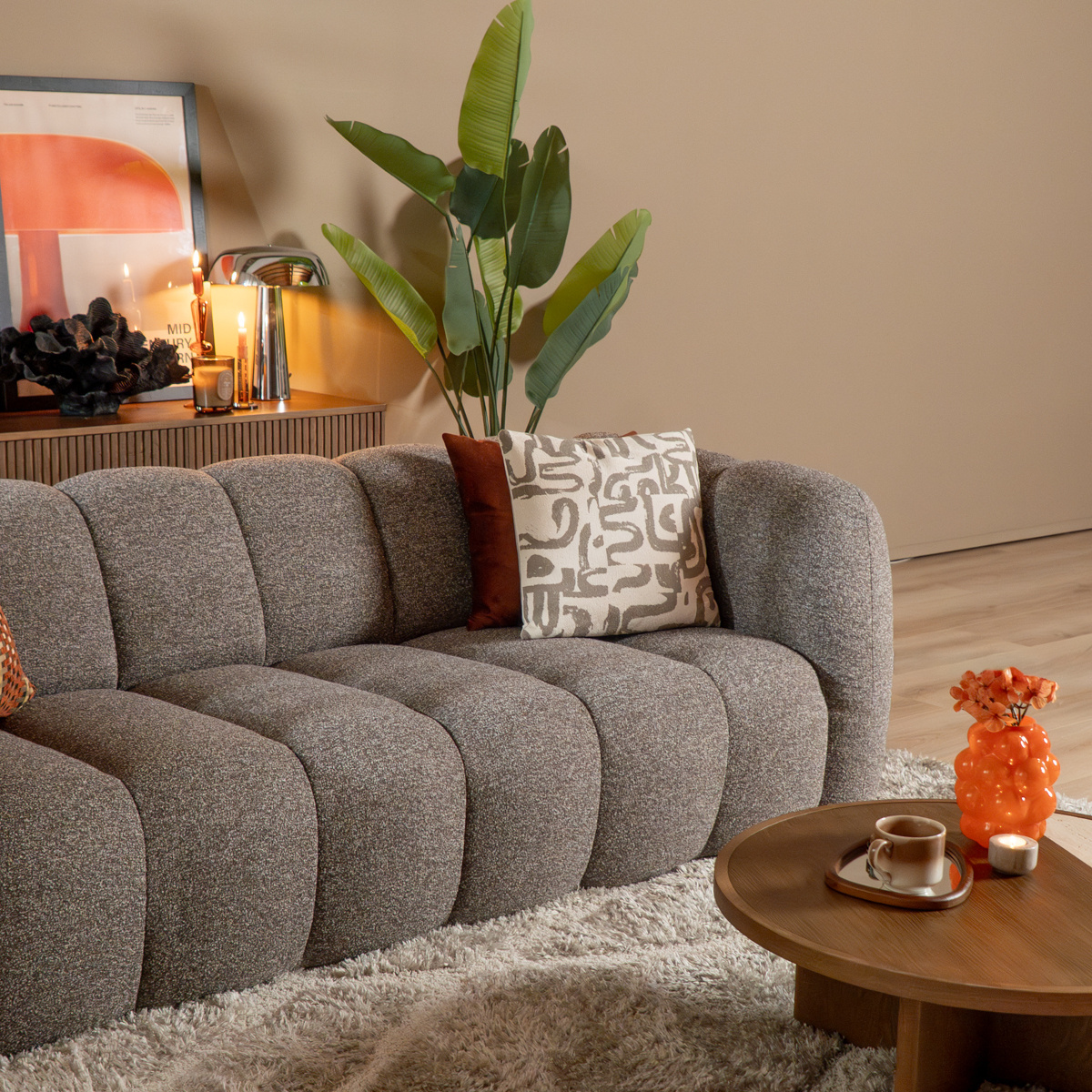De Luca bank is bekleed met een stof van 100% polyester. Polyester is een sterk en duurzaam materiaal met een hoge Martindale score van 38.000, wat betekent dat de stof uitstekend bestand is tegen slijtage. De bouclé stof, met zijn kenmerkende lusachtige structuur, geeft de bank een warme, moderne en luxe uitstraling die perfect aansluit bij hedendaagse woontrends.