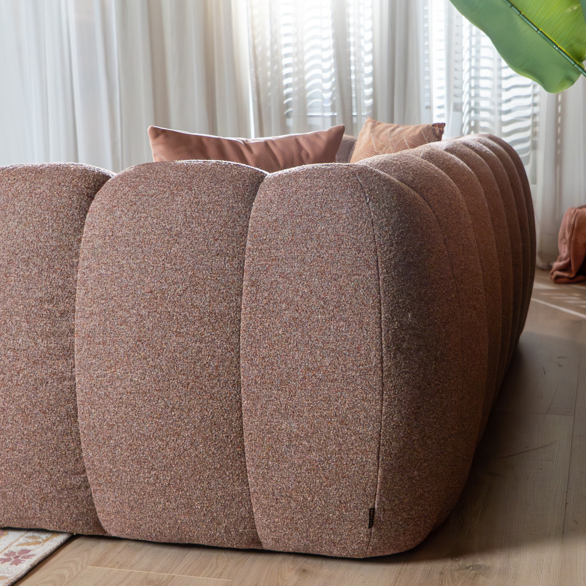 De Luca bank is bekleed met een stof van 100% polyester. Polyester is een sterk en duurzaam materiaal met een hoge Martindale score van 38.000, wat betekent dat de stof uitstekend bestand is tegen slijtage. De bouclé stof, met zijn kenmerkende lusachtige structuur, geeft de bank een warme, moderne en luxe uitstraling die perfect aansluit bij hedendaagse woontrends.