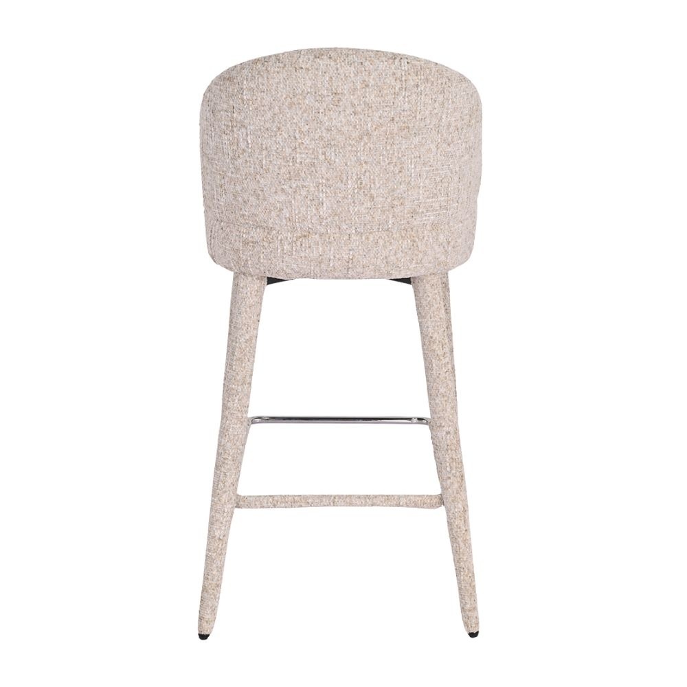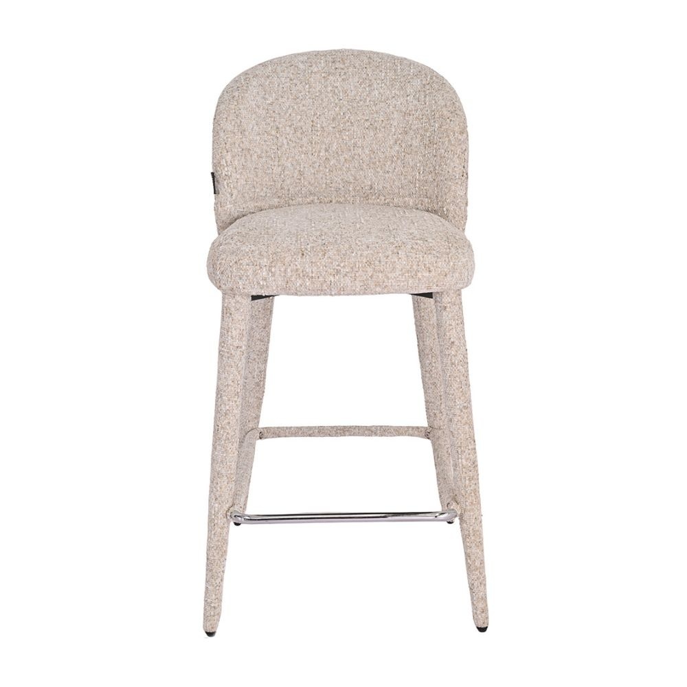 Deze moderne barkruk onderscheidt zich door zijn unieke design: volledig door gestoffeerd, van de comfortabele zitting tot de elegante poten. Het resultaat is daardoor een harmonieus en stijlvol geheel dat direct opvalt.
