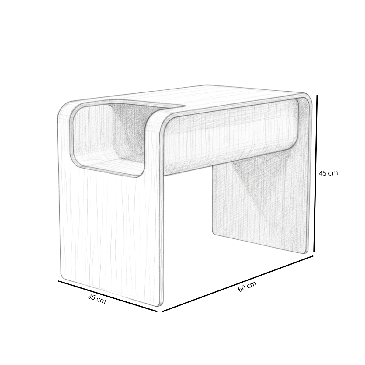De bijzettafel bevat een laag eikenfineer. Eikenfineer straalt warmte uit en is duurzaam. Eikenfineer is gevoelig voor krassen en deuken dus het is belangrijk om de tafel goed te beschermen. Het is ook een goed idee om het meubel uit direct zonlicht te houden omdat dit de kleur van het fineer na verloop van tijd kan vervagen. Daarnaast is eikenfineer wel erg sterk, het buigt niet en trekt niet krom. Onder de laag eikenfineer is de salontafel gemaakt van multiplex.