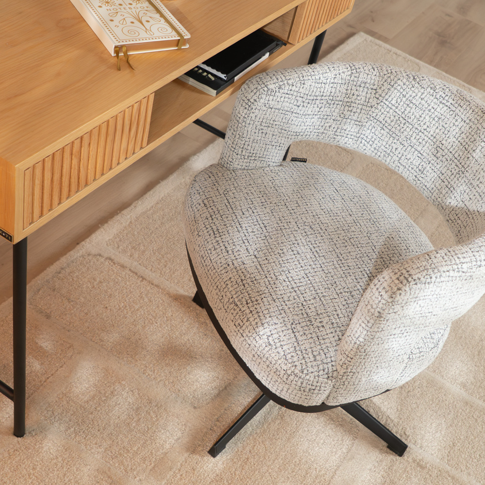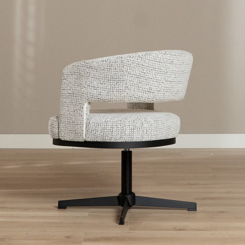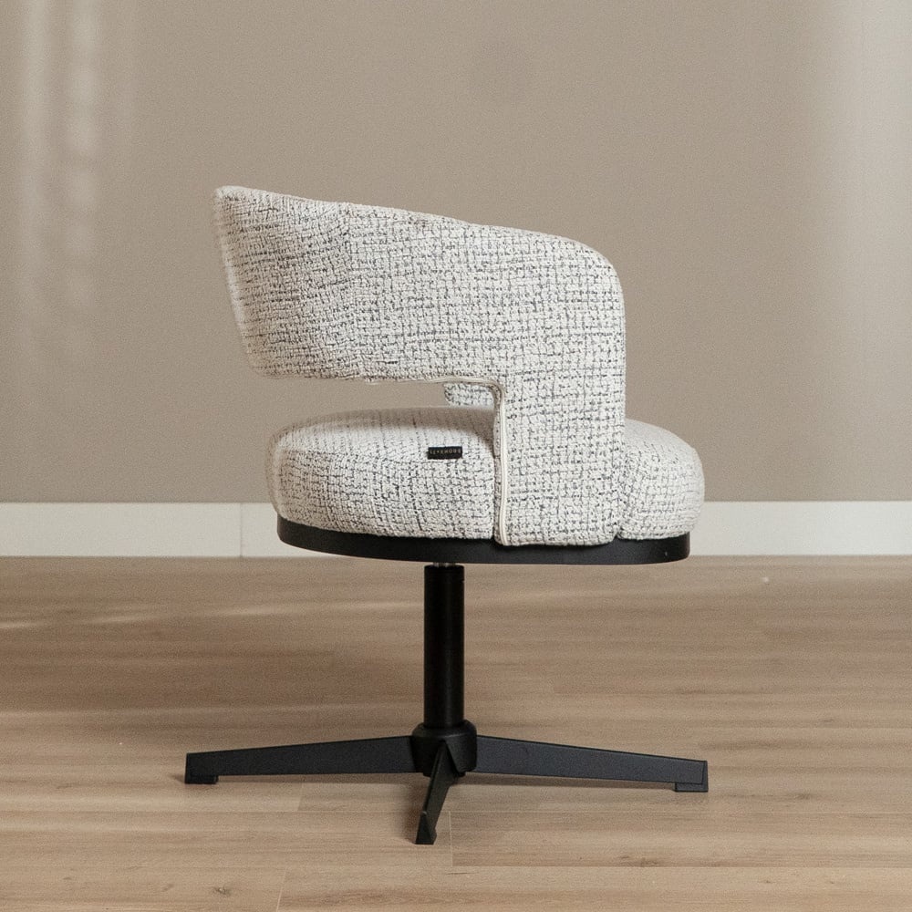 Het zwarte metalen onderstel is 180 graden draaibaar, waardoor gebruikers eenvoudig van richting kunnen veranderen zonder de fauteuil te verplaatsen. Dit maakt Gino bijzonder geschikt voor lobby’s, lounges, wachtruimtes en hotelkamers, waar flexibiliteit en comfort centraal staan.