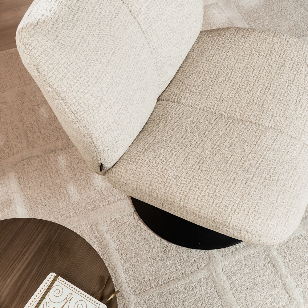 Draaifauteuil Moira is een compacte en comfortabele zitoplossing die ideaal is voor ruimtes waar zowel functionaliteit als uitstraling belangrijk zijn. De gemêleerde beige stoffering en de afgeronde vormen geven de fauteuil een moderne en representatieve look, passend binnen uiteenlopende interieurconcepten.