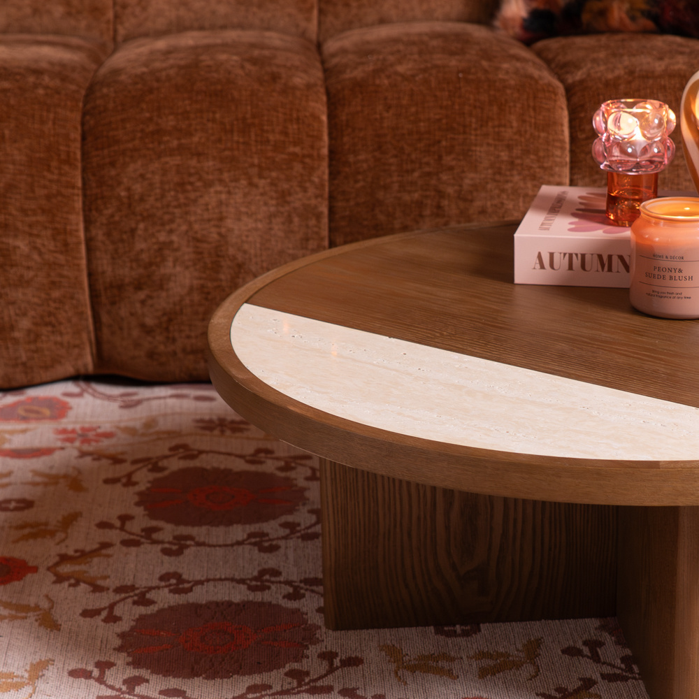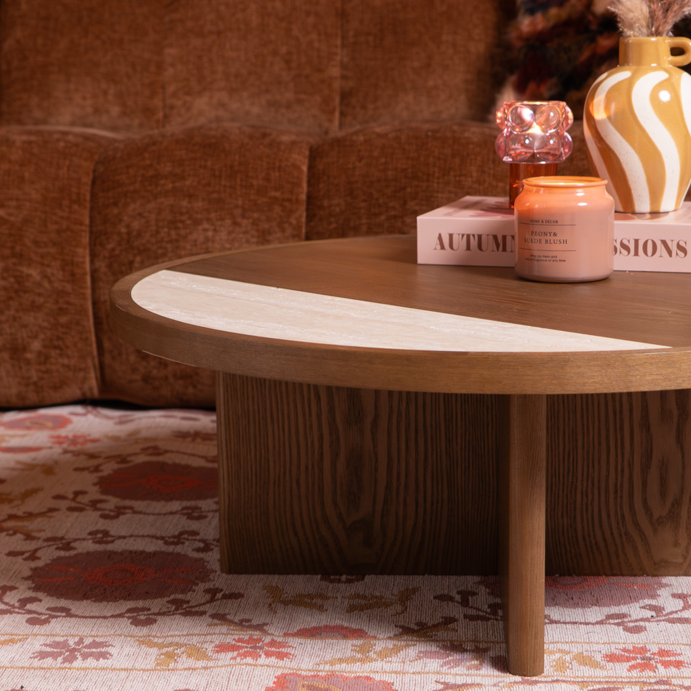 Salontafel Maeva is een stijlvol middelpunt voor elke kamer. Met haar ronde vorm van Ø80 cm en het opvallende contrast tussen eikenhout en een ingelegd travertin deel, brengt Maeva een perfecte balans tussen elegantie en natuurlijke materialen.
