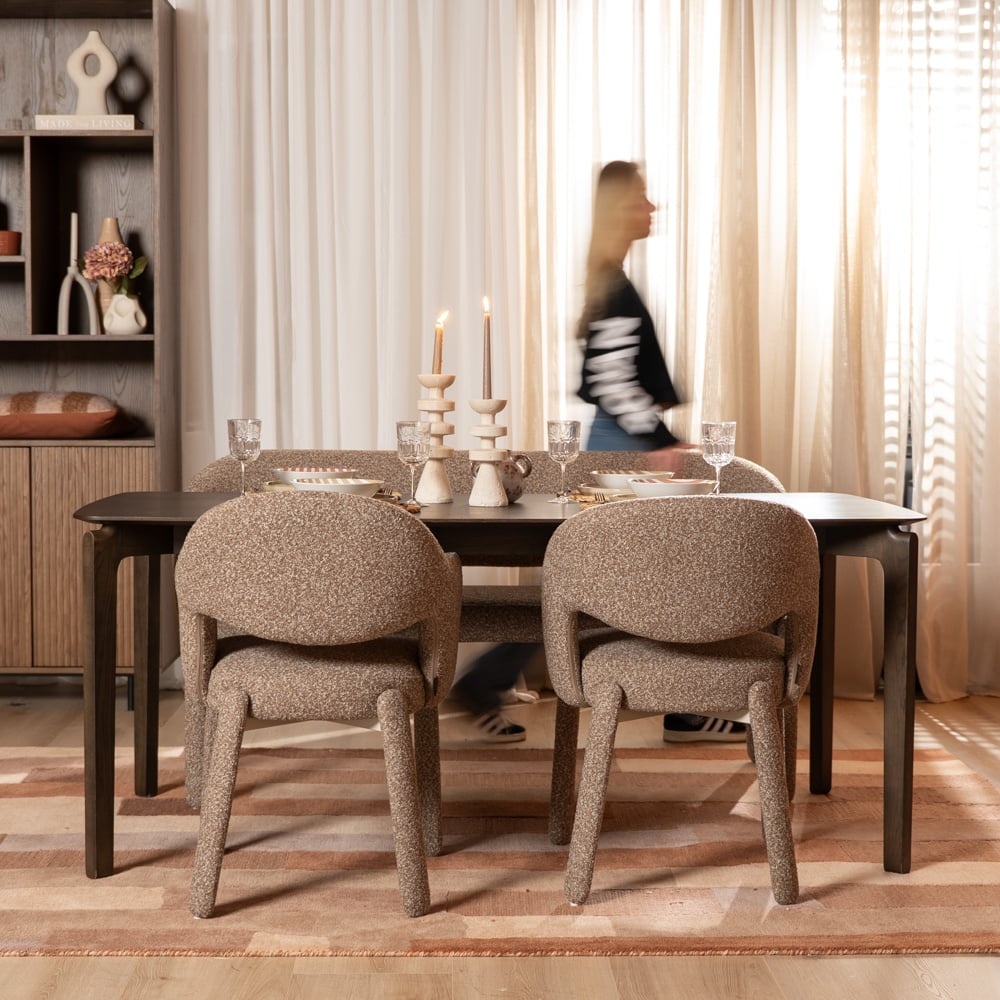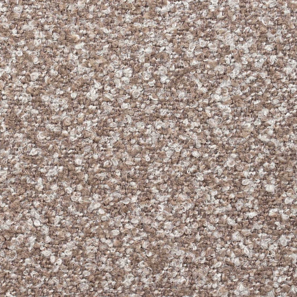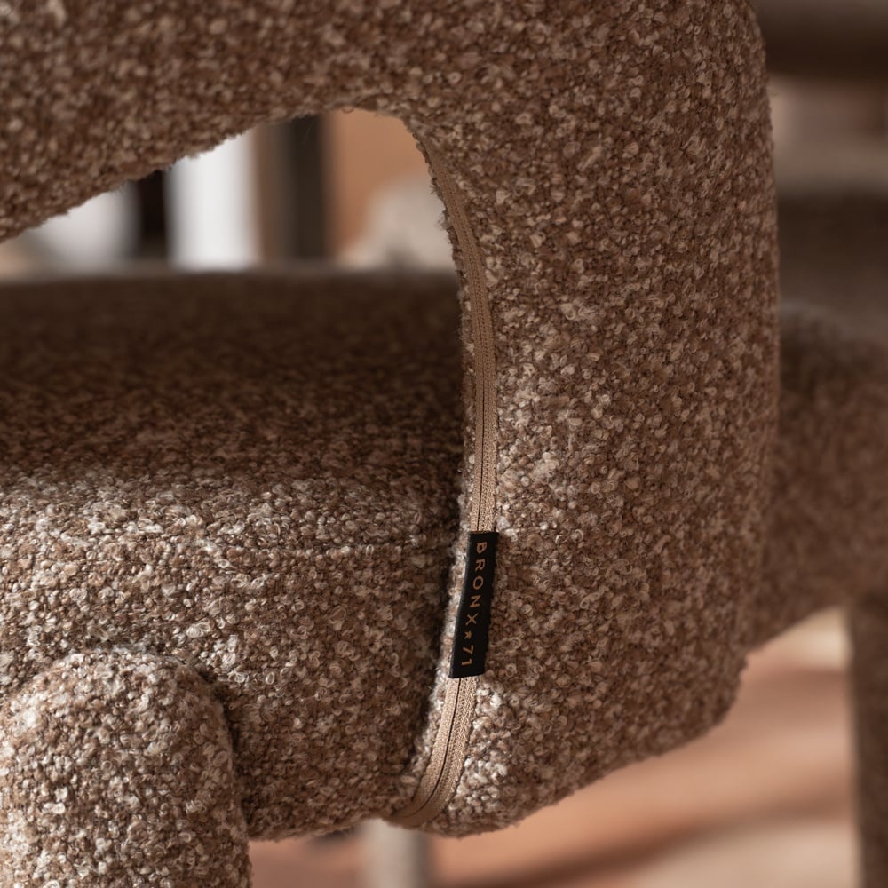 De stoel is bekleed met hoogwaardige bouclé stof met een gemêleerde draad, wat zorgt voor een rijke textuur en een moderne uitstraling. De doorgestoffeerde poten rusten op een stevig ijzeren frame. De combinatie van doorgestoffeerde poten en een stabiel frame zorgt voor langdurig comfort.