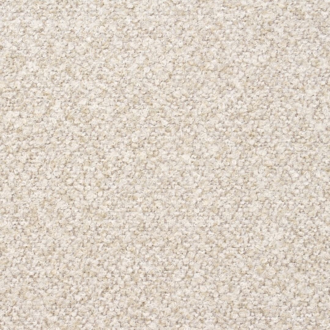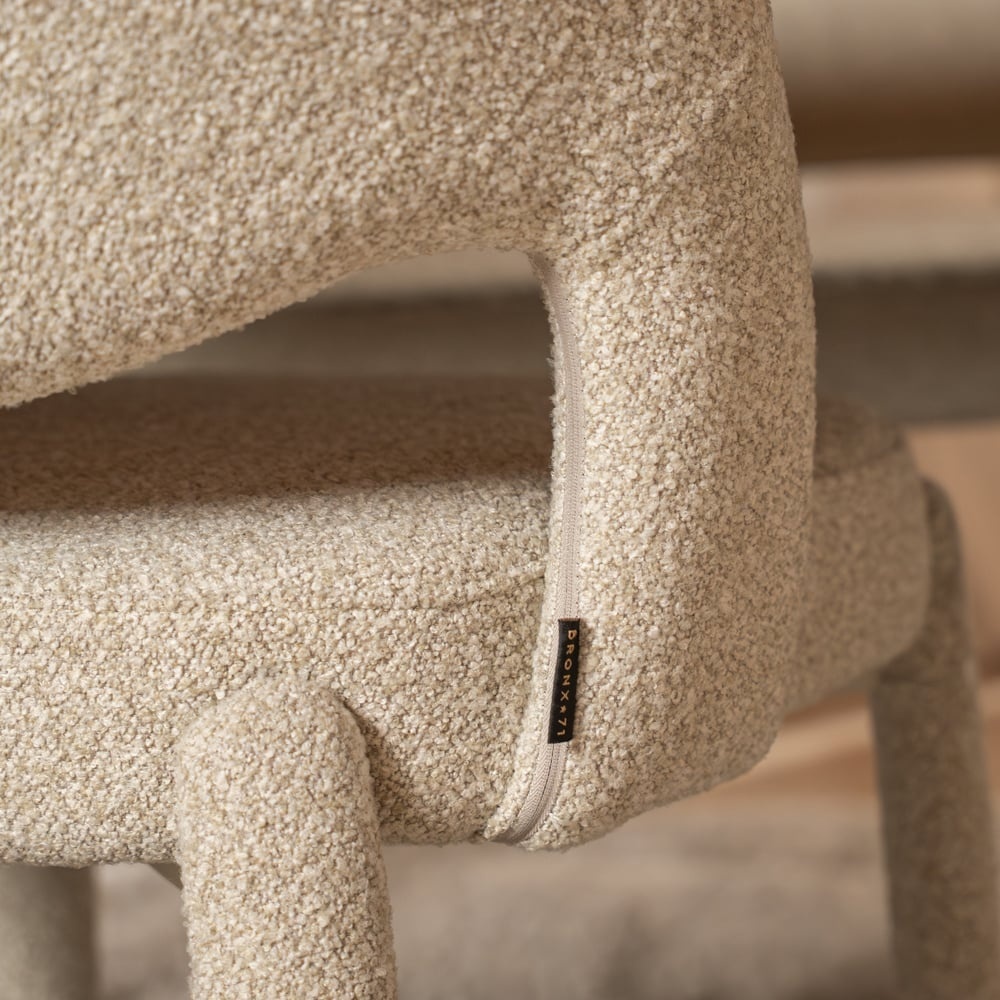 De stoel is bekleed met hoogwaardige bouclé stof met een gemêleerde draad, wat zorgt voor een rijke textuur en een moderne uitstraling. De doorgestoffeerde poten rusten op een stevig ijzeren frame. De combinatie van doorgestoffeerde poten en een stabiel frame zorgt voor langdurig comfort.