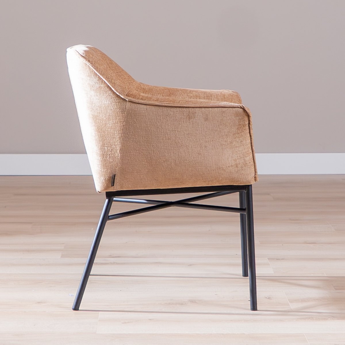 De stoel heeft een extra verstevigd metalen onderstel en is bekleed met duurzame chenille die waterafstotend is. De plek blijft fris en netjes, onderhoud verloopt eenvoudig door regelmatig te reinigen met een vochtige doek of een textiel care kit. De Eddy stof is een comfortabele chenille stof van 100% polyester. Deze stof heeft een Martindale score van 60.000, wat betekent dat de bank zeer slijtvast is en geschikt voor intensief gebruik. De stof voelt zacht aan en heeft een luxe uitstraling, wat bijdraagt aan het comfortabele zitgevoel.