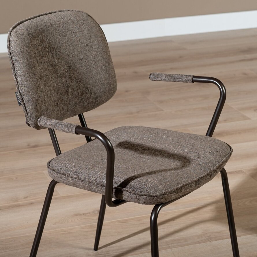 De stoel heeft een industrieel karakter, maar de combinatie van de gemêleerde stof met subtiele glans en het donkerbruine frame maakt de stoel een echt statement aan de elke tafel.