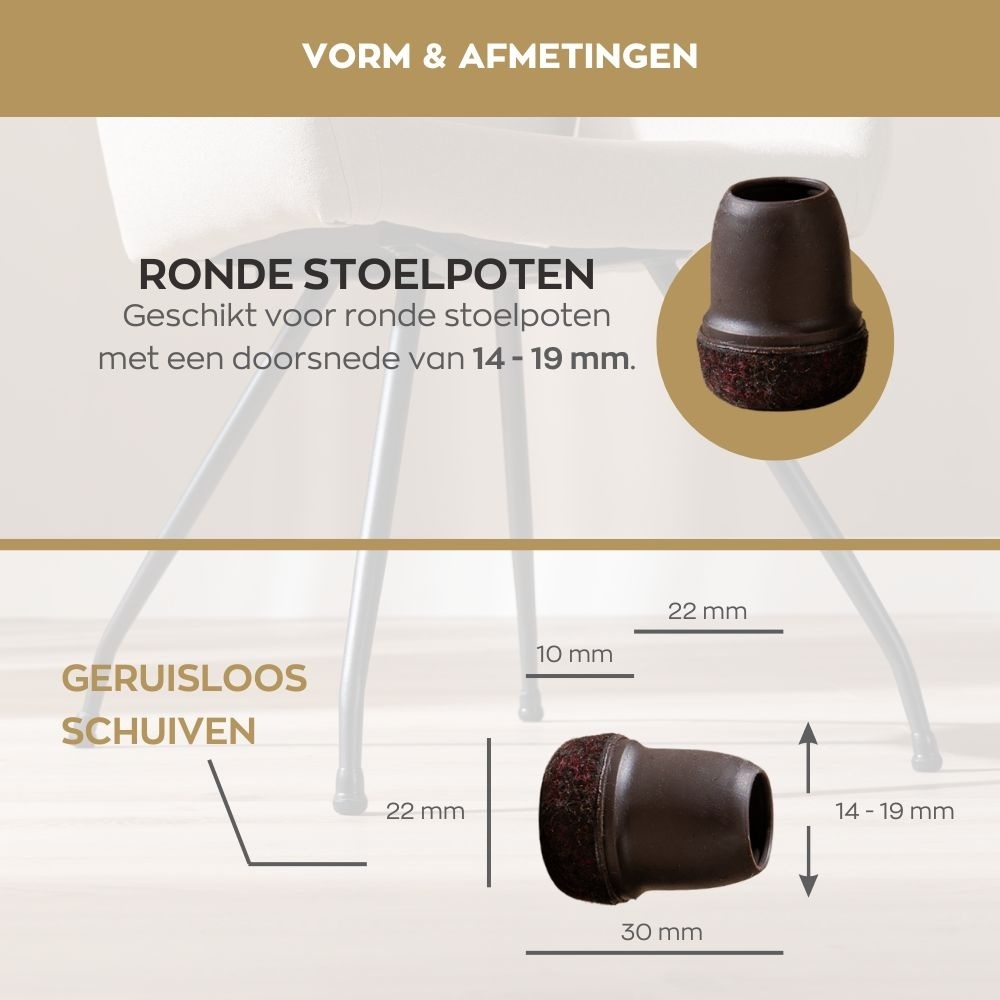 Belangrijk: Meet de stoelpoot vooraf nauwkeurig op voor de perfecte pasvorm. De doppen zijn licht flexibel, waardoor je ze moeiteloos over de poten schuift. Bescherm je vloer en geniet van een stille, krasvrije woonruimte met onze duurzame vloerbeschermers!