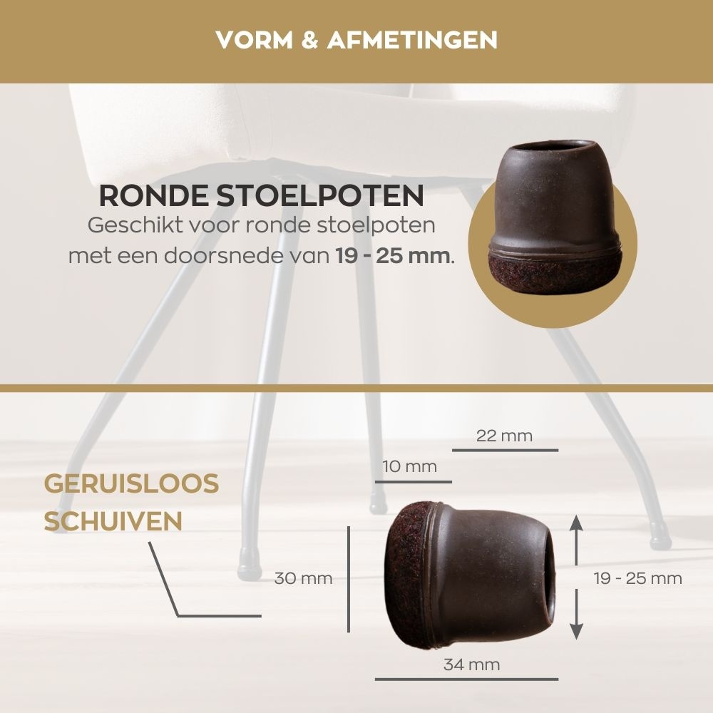 Belangrijk: Meet de stoelpoot vooraf nauwkeurig op voor de perfecte pasvorm. De doppen zijn licht flexibel, waardoor je ze moeiteloos over de poten schuift. Bescherm je vloer en geniet van een stille, krasvrije woonruimte met onze duurzame vloerbeschermers!